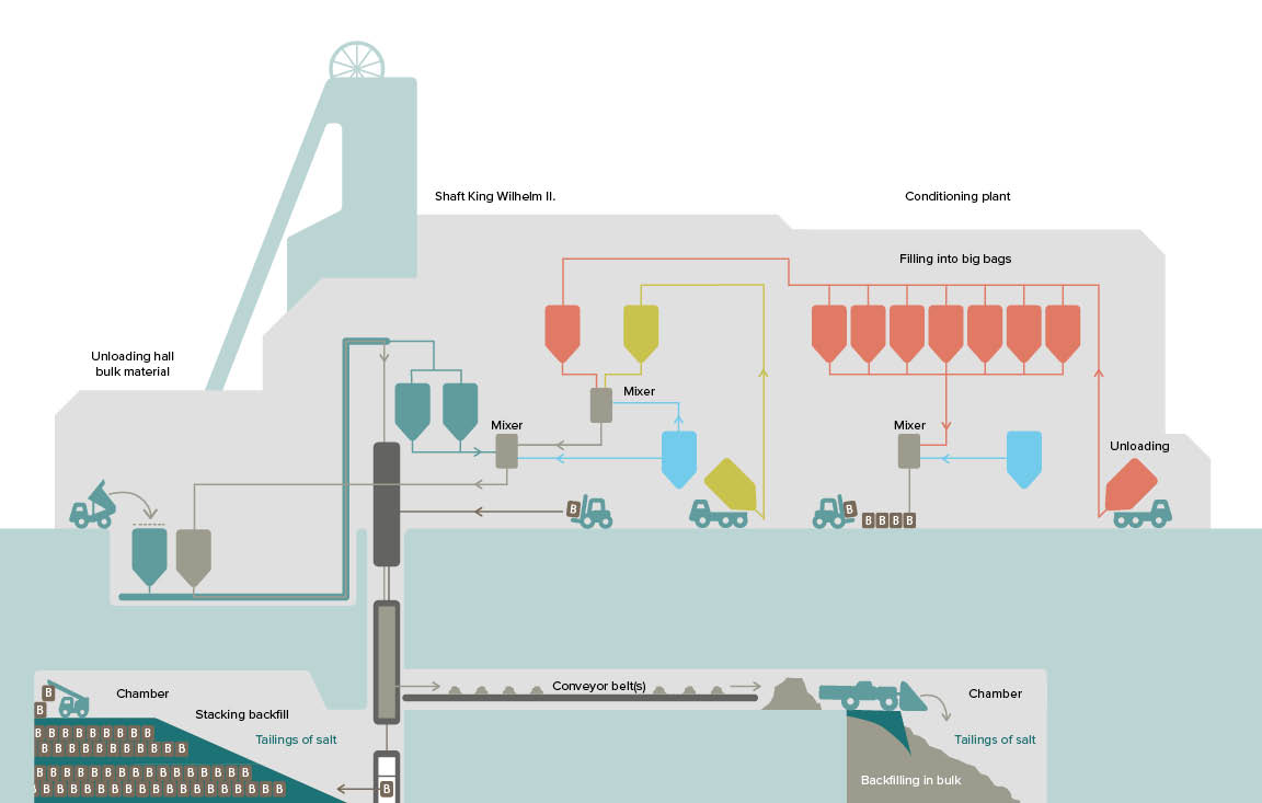The conditioning plant is available to treat and then package waste for disposal in the mines in Heilbronn and Bad Friedrichshall. Particulate, liquid and filter cake waste are processed here and packed into big bags. Bulk waste is unloaded in a hall and processed into mine grout.
